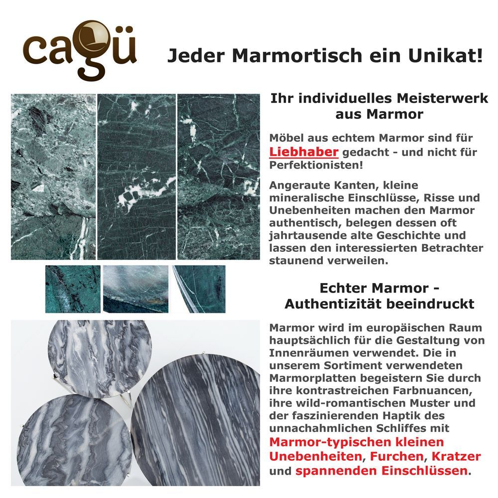 Jede einzelne Marmorplatte begeistert mit ihrer Farbgebung und individuellen Gesteinsmerkmalen, kleinen Unebenheiten und Einschlüssen, diese unterstreichen die Authenzität dieses beliebten Naturwerkstoffes und die absolute Einzigartigkeit jedes einzelnen Modells. Deshalb ist jeder Marmor-Beistelltisch ein Unikat mit einzigartiger Maserung.