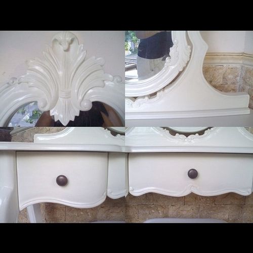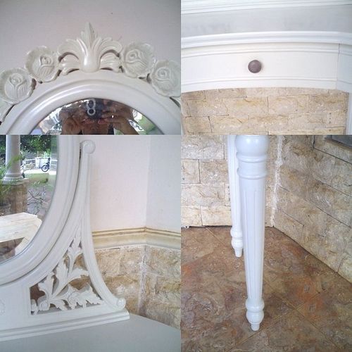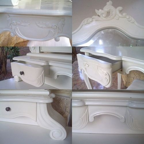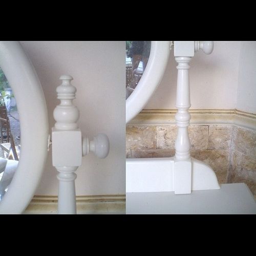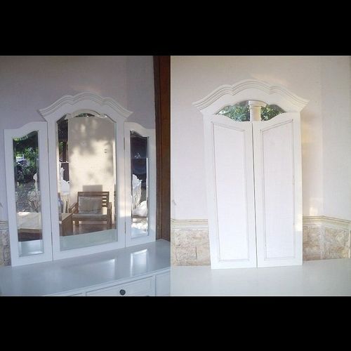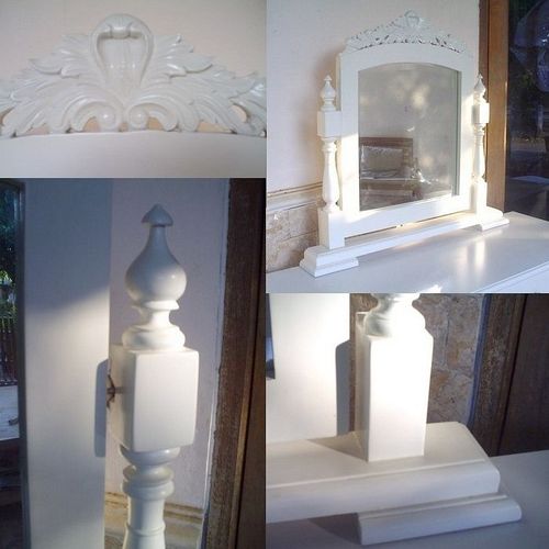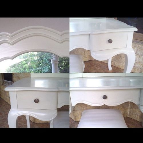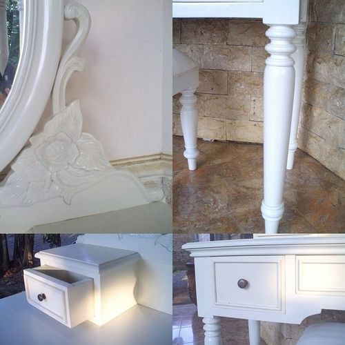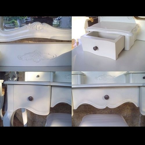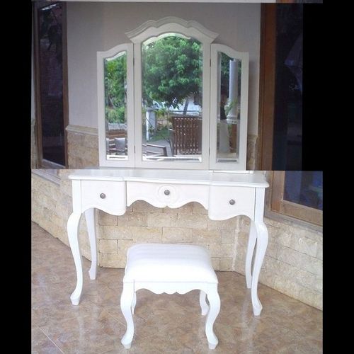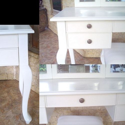 | Maße (ca.): | Frisiertisch: 90cm x 46cm x 75cm (B x T x H) Spiegel: 80cm x 60cm (B x H) Hocker: 36cm x 26cm x 46cm (B x T x H) |
